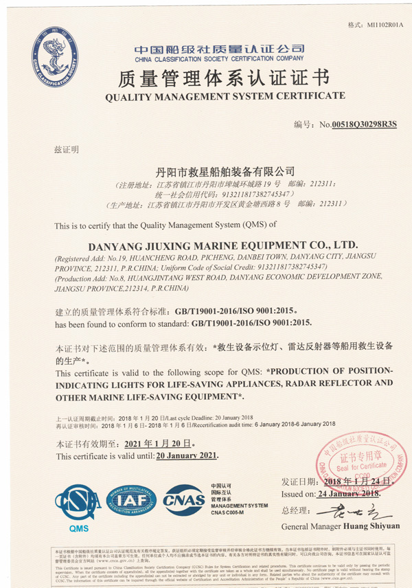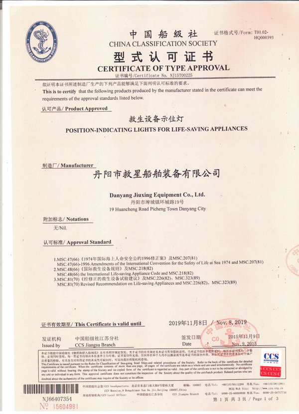 丹陽市救星船舶裝備有限公司為丹陽市船舶救生照明設備廠子公司,主要生產救生設備示位燈、雷達反射器、引航員軟梯、登乘梯等產品。其中救生設備示位燈采用國際上最先進的科學技術、生產工藝,優(yōu)質材料制造,各項技術指標超過國際先進水平,完全滿足國際最新標準。2012年元月取得“CCS”型式認可證書,并具有歐共體“EC”證書。另外本公司制造的RDF400雷達反射器還獲得了實用新型專利。